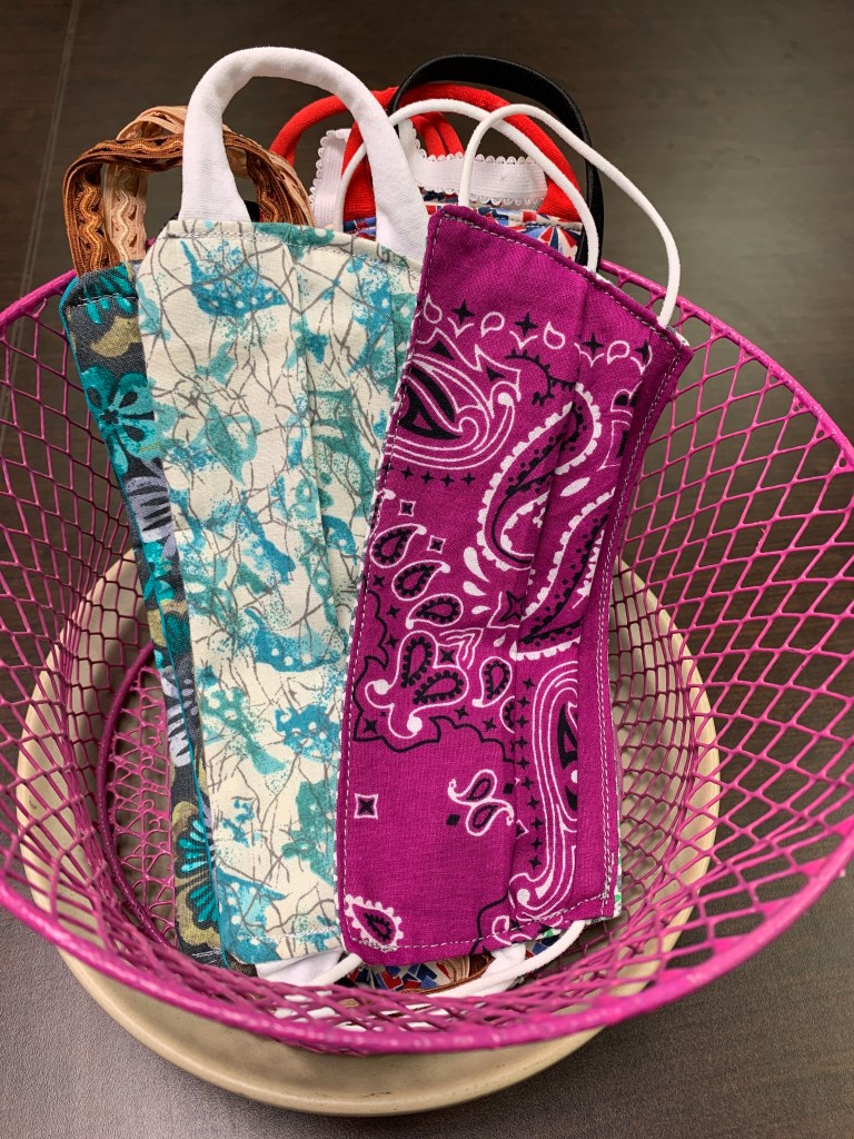 I start my day now always feeling a bit overwhelmed by it all, I have learned to take a stoic approach and I remind myself what is happening around me is beyond my control, all that I can control is how I respond. So… I arrive to work and wipe down tables, prepare for class and spray disinfectant spray on the areas I know people will touch. I display the homemade cloth masks I have made for my students on my desk, they may take one if they need one. I tell them I have made these so that we all remain healthy and it’s the least I can do to help.